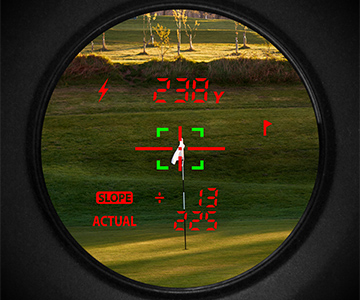 Slope-toiminto, Etäisyysmittari laskee rinteen kaltevuustason kohti pistettä, jonka etäisyyden haluat saada selville. Sitten se ilmoittaa todellisen etäisyyden kohteeseesi laskelmiensa perusteella. Voit siten valita helposti sopivan mailan lyöntiä varten.